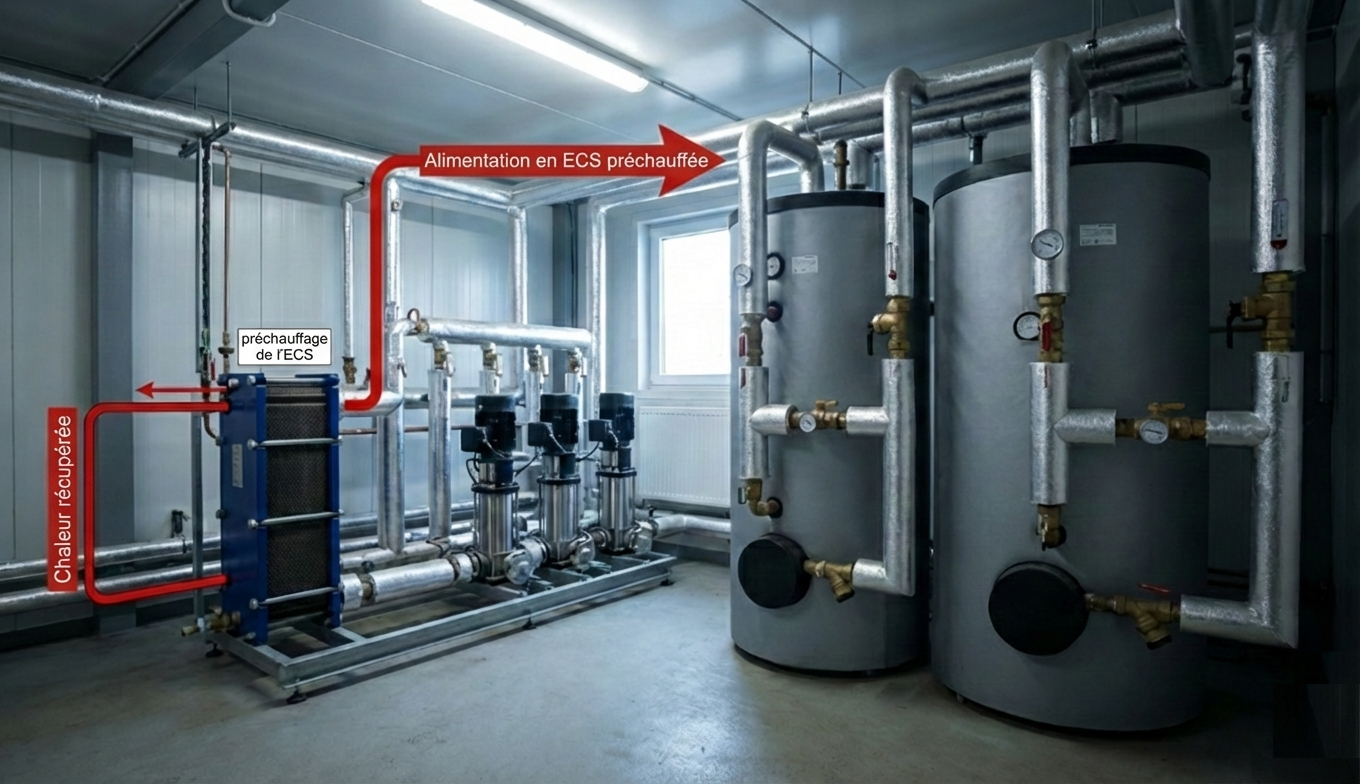Utilisez la chaleur disponible pour préchauffer l’ECS, en réduisant l’appel chaudière ou le « lift » d’une pompe à chaleur.