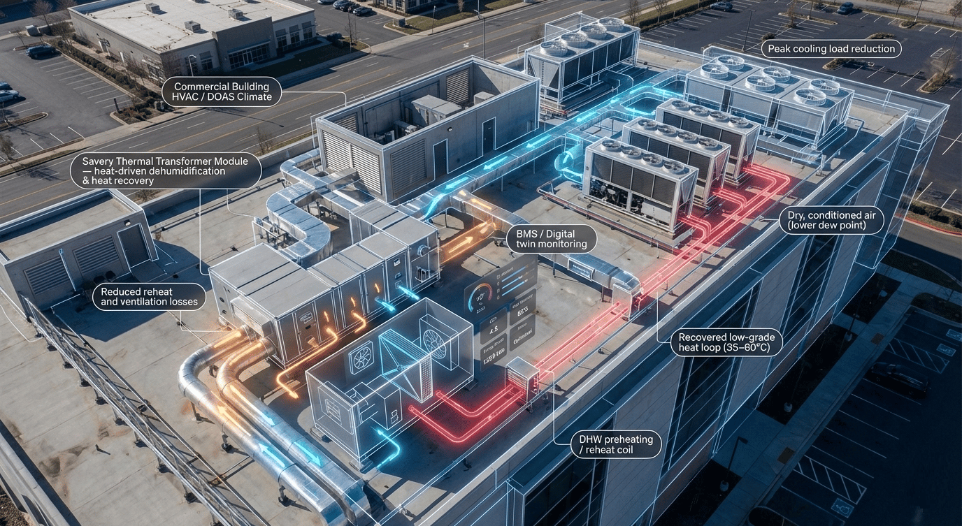 Savery’s thermal platform reclaims waste heat from HVAC and building systems and converts it into cooling, dehumidification, and usable hot water. Designed for retrofit realities, it improves comfort, reduces peak electricity demand, and stabilizes performance across seasons.