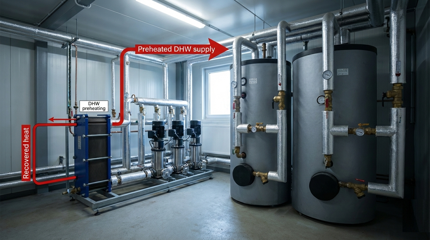 Use available waste heat to preheat domestic hot water, reducing boiler or heat-pump lift.