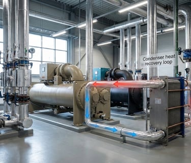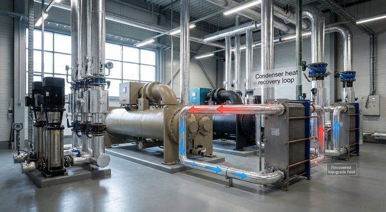 Recover condenser heat and rejected heat streams to reduce cooling electricity and create useful thermal output where needed.