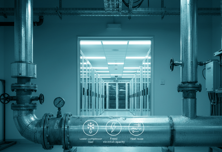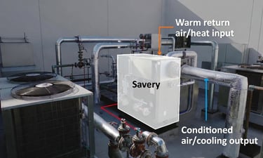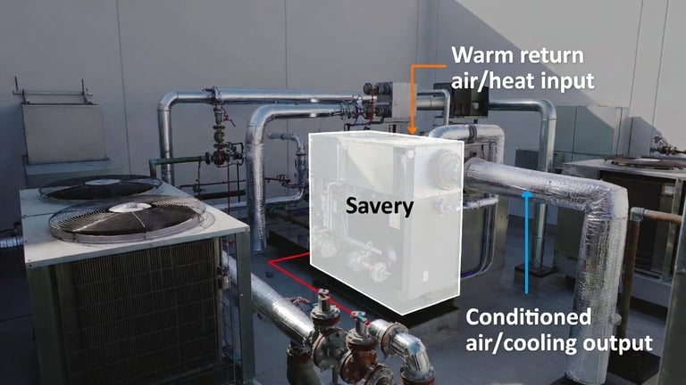 Savery’s Thermal Transformer Modules use low-grade rack heat to drive heat-driven cooling while delivering exportable heat for reuse pathways. The result is lower compressor load, freed electrical capacity, and improved resilience—without fluorinated refrigerants.