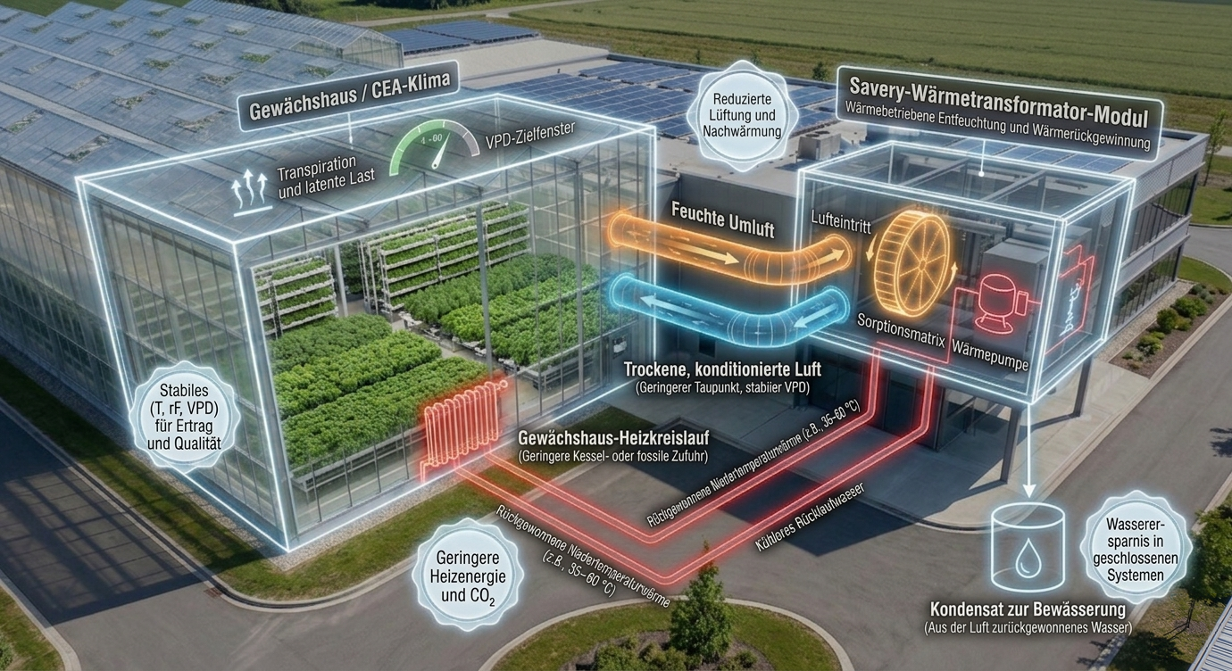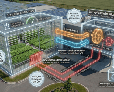 CEA-Anlagen arbeiten mit dichten Beständen, hoher Einstrahlung und engen VPD-Fenstern. „Heizen und Lüften“ wirft warme CO₂-reiche Luft aus, um Feuchte zu kontrollieren. Savery integriert Sorption in die Klimaschleife: Innenluft wird rezirkuliert und entfeuchtet; latente Wärme wird in den Heizkreis zurückgeführt. So sinken Heizbedarf, CO₂-Verluste und Wasserverbrauch – bei stabilem VPD.