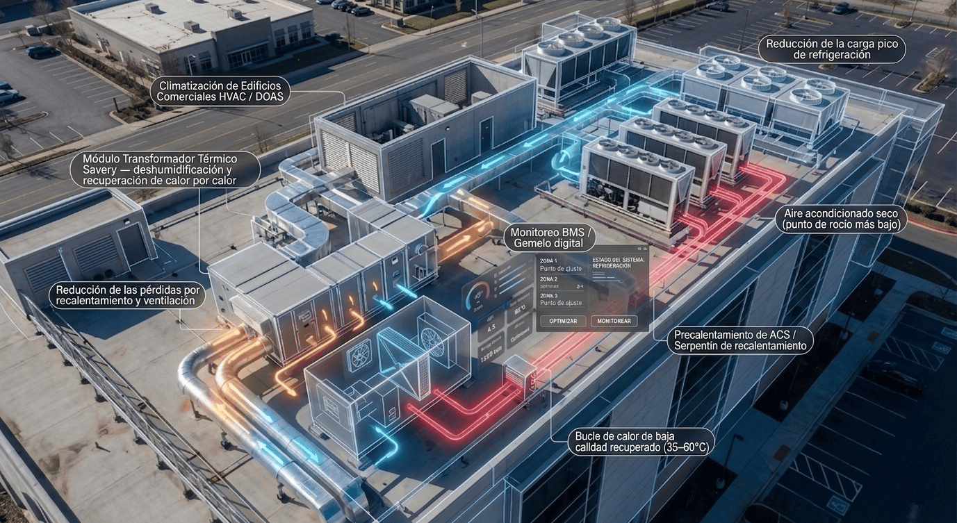 La plataforma térmica de Savery recupera calor residual de sistemas HVAC y de equipos del edificio, y lo convierte en frío, deshumidificación y calor útil (por ejemplo, ACS). Diseñada para realidades de retrofit, mejora el confort, reduce picos de demanda eléctrica y estabiliza el rendimiento a lo largo de las estaciones.