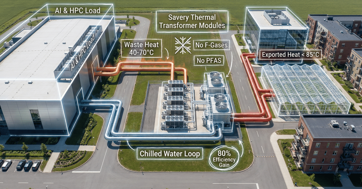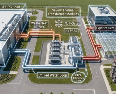 Savery’s Thermal Transformer Modules use low-grade heat from AI, HPC and mining racks to drive heat-driven cooling and deliver exportable heat. This reduces compressor load, frees electrical capacity and lowers carbon emissions, without fluorinated refrigerants.